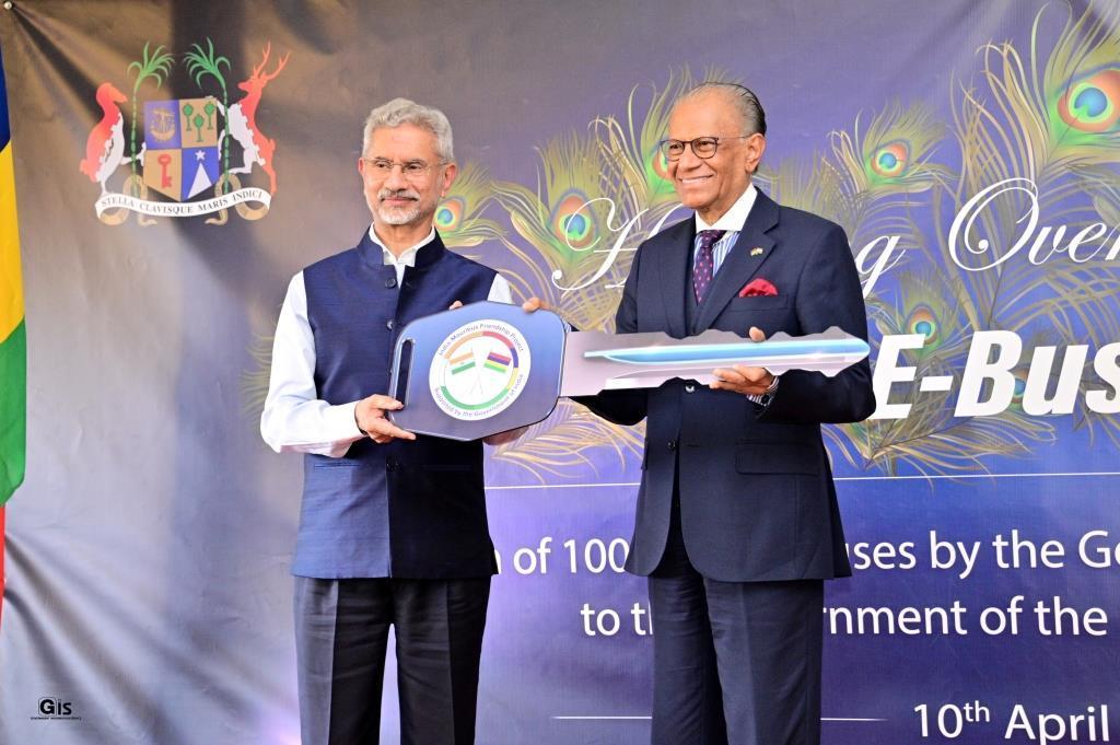 At a ceremony held this afternoon at the Rose Belle Market Fair, the Minister of External Affairs of India, Dr Subrahmanyam Jaishankar, symbolically presented a key to the Prime Minister, Dr Navinchandra Ramgoolam, officially marking the transfer of the buses. The event was attended by the Minister of Land Transport, Mr Mahomed Osman Cassam Mahomed, along with other Ministers, Members of Parliament, and distinguished guests.