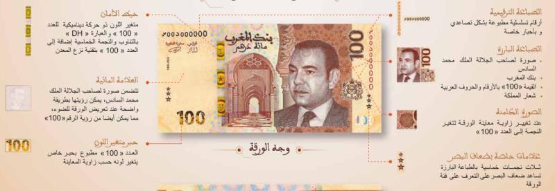 وتبرز الورقة البنكية من فئة 100 درهم، حسب المصدر ذاته، :التراث الثقافي للصحراء المغربية وتطورها الاجتماعي والاقتصادي وانفتاحها على إفريقيا، وتحمل الورقة على الوجه صورة صاحب الجلالة الملك محمد السادس وشعار المملكة وتفاصيل هندسية مستوحاة من الأبواب المغربية والأقواس المزخرفة المسجد الحسن الثاني بالدار البيضاء”.