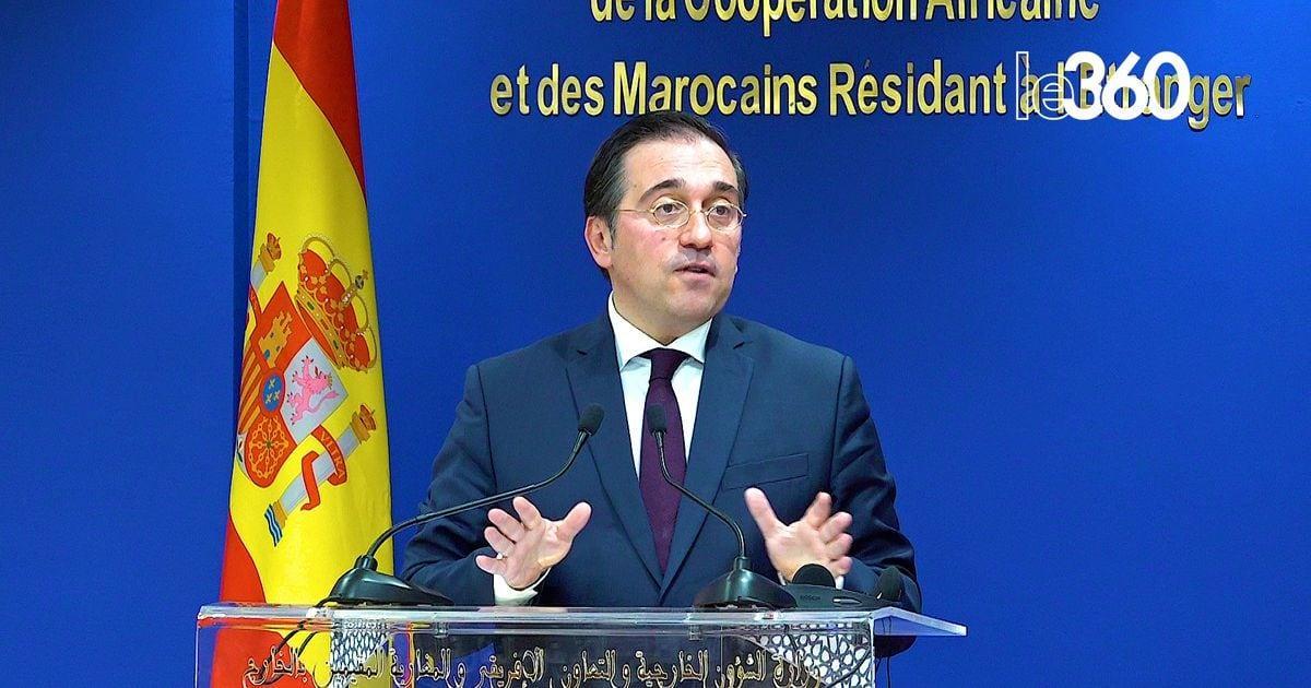 وأكد رئيس الدبلوماسية الإسبانية، خلال ندوة صحفية مشتركة بالرباط عقب مباحثاته مع وزير الشؤون الخارجية والتعاون الإفريقي والمغاربة المقيمين بالخارج، ناصر بوريطة، أن «موقف إسبانيا المتعلق بقضية الصحراء لم يتغير، وهو الموقف الذي سبق التعبير عنه في الإعلان المشترك الذي تمت المصادقة عليه في 7 أبريل 2022، والإعلان الذي توج الدورة 12 للاجتماع رفيع المستوى المغرب – إسبانيا المنعقد في فبراير 2023′′.