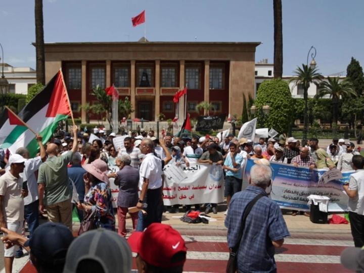 وردّد المحتجون شعارات من قبيل “ناضل يا مناضل”، “صْوَا اليوم صْوَا غدا الجمعية ولابد”. كما حملوا أعلام فلسطين ولافتات مكتوب عليها عبارات تعلن مُساندة النضال الفلسطيني وتنتقد التطبيع مع إسرائيل.
