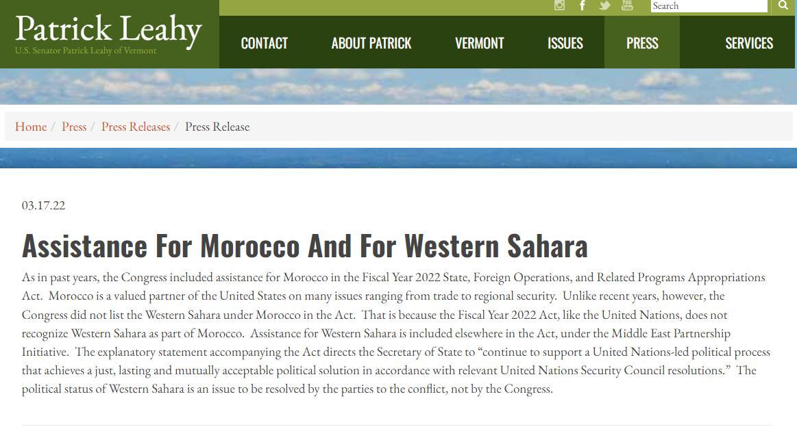 وأكد السيناتور باتريك ليهي أن الوضع السياسي للصحراء الغربية هو قضية يجب حلها من قبل أطراف النزاع، وليس من قبل الكونغرس”.