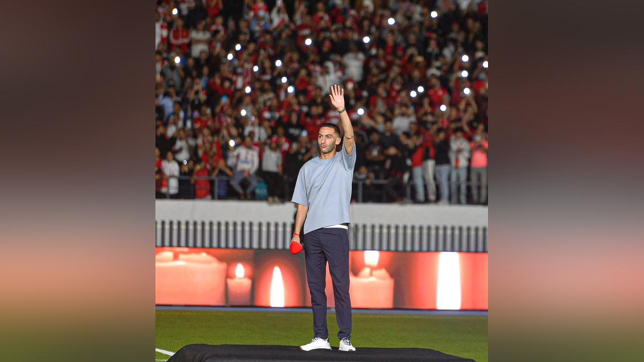 تم تقديم حكيم زياش رسميًا في ملعب محمد الخامس??? ©️ @532off/@TFT_Morocco pic.twitter.com/Db65S4p15b —??????????????????? |??? (@MFN_TW) 2 نوفمبر 2025 جلس النجم المغربي بين أنصار الفريق على منصة خاصة فوق لافتة تحمل اسمه، متابعا المباراة التي انتهت بفوز الوداد 2–0، بتمريرة حاسمة من نور الدين أمرابط.