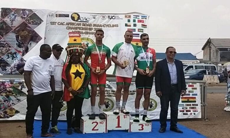 أفريقيا برس – المغرب. توج الدراجان المغربيان هيثم العمراوي ومحمد بوشفار بالذهب والفضة في السباق على الطريق فردي عام في فئة ذوي الهمم، الذي جرى اليوم الجمعة على مسافة 6ر36 كلم، ضمن منافسات البطولة الأفريقية للسباقات على الطريق ولذوي الهمم التي تستضيفها العاصمة الغانية اكرا ( 8- 17 فبراير ).