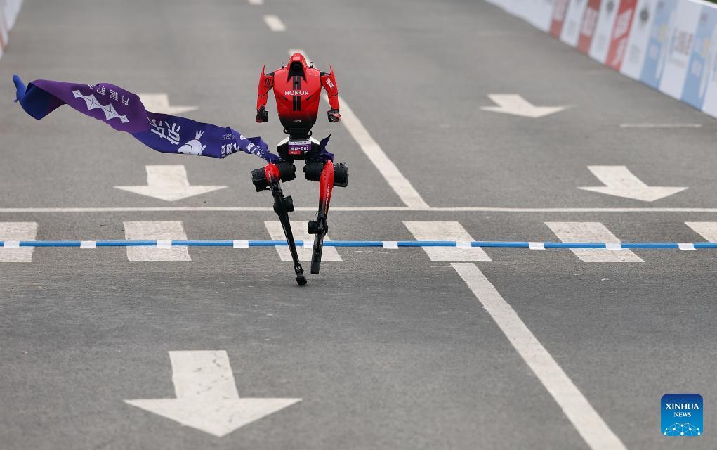 Humanoid robot “Flash” of Jueyingchitu Team in the remote-controlled category crosses the finish line during the Beijing E-Town half-marathon and humanoid robots half-marathon in the Beijing Economic-Technological Development Area in southeast Beijing, China, April 19, 2026. (Xinhua/Zhang Chenlin)