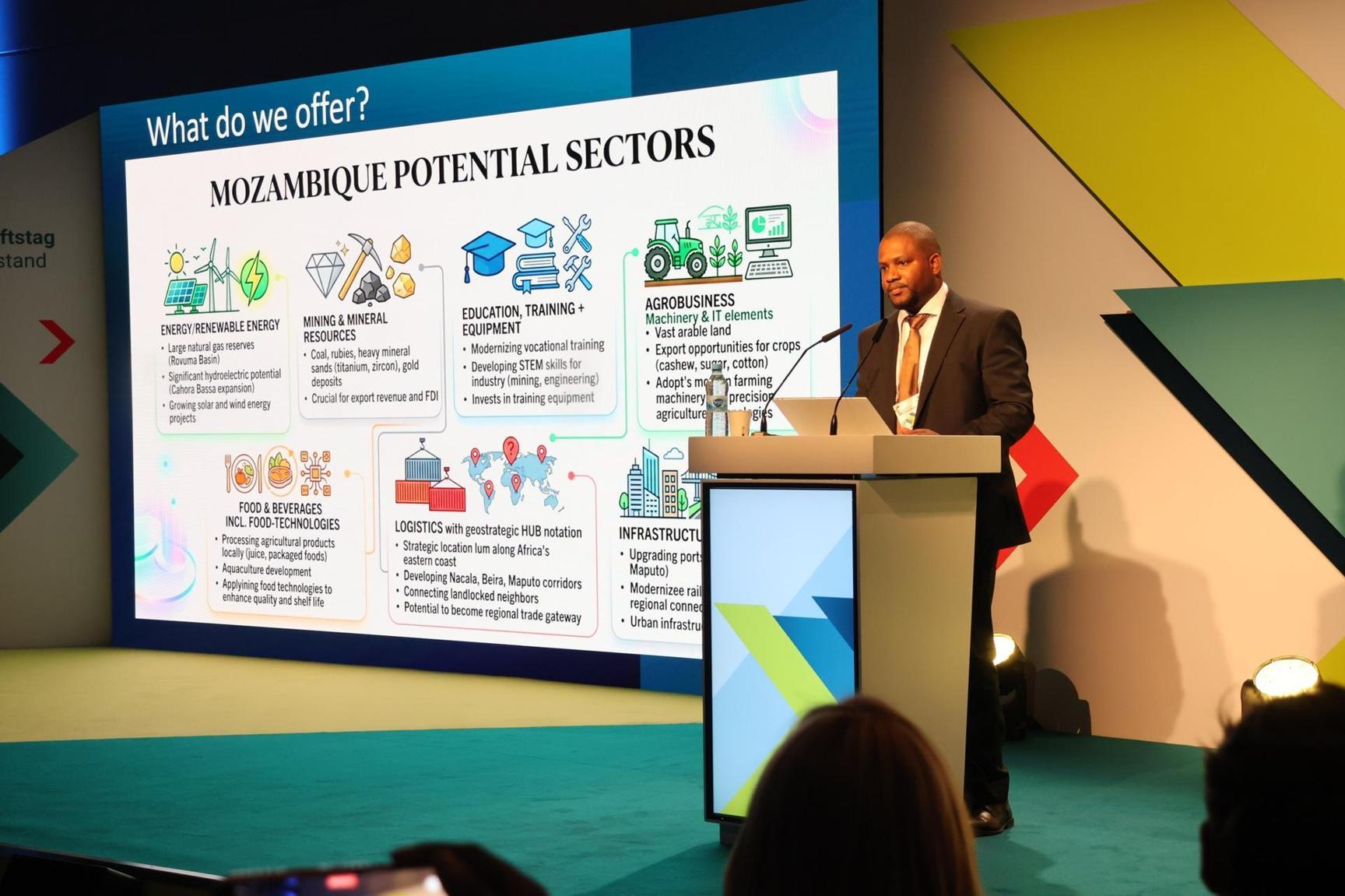 In the same intervention, he highlighted opportunities in infrastructure, energy, housing, agro-processing, logistics, water, sanitation, water resources, digitalisation and certification of micro, small and medium enterprises, presenting Mozambique as a country with a strategic location, a growing market and political will to deepen economic relations with Germany.