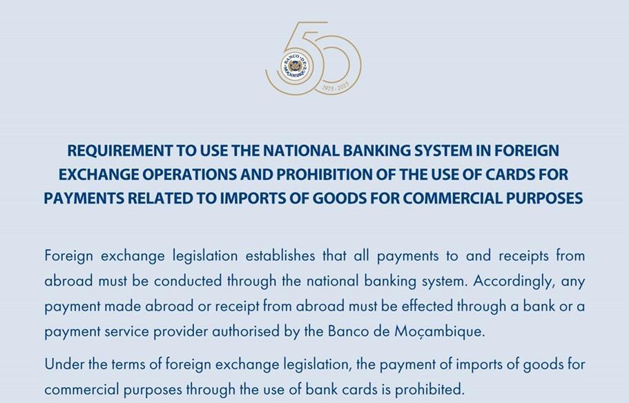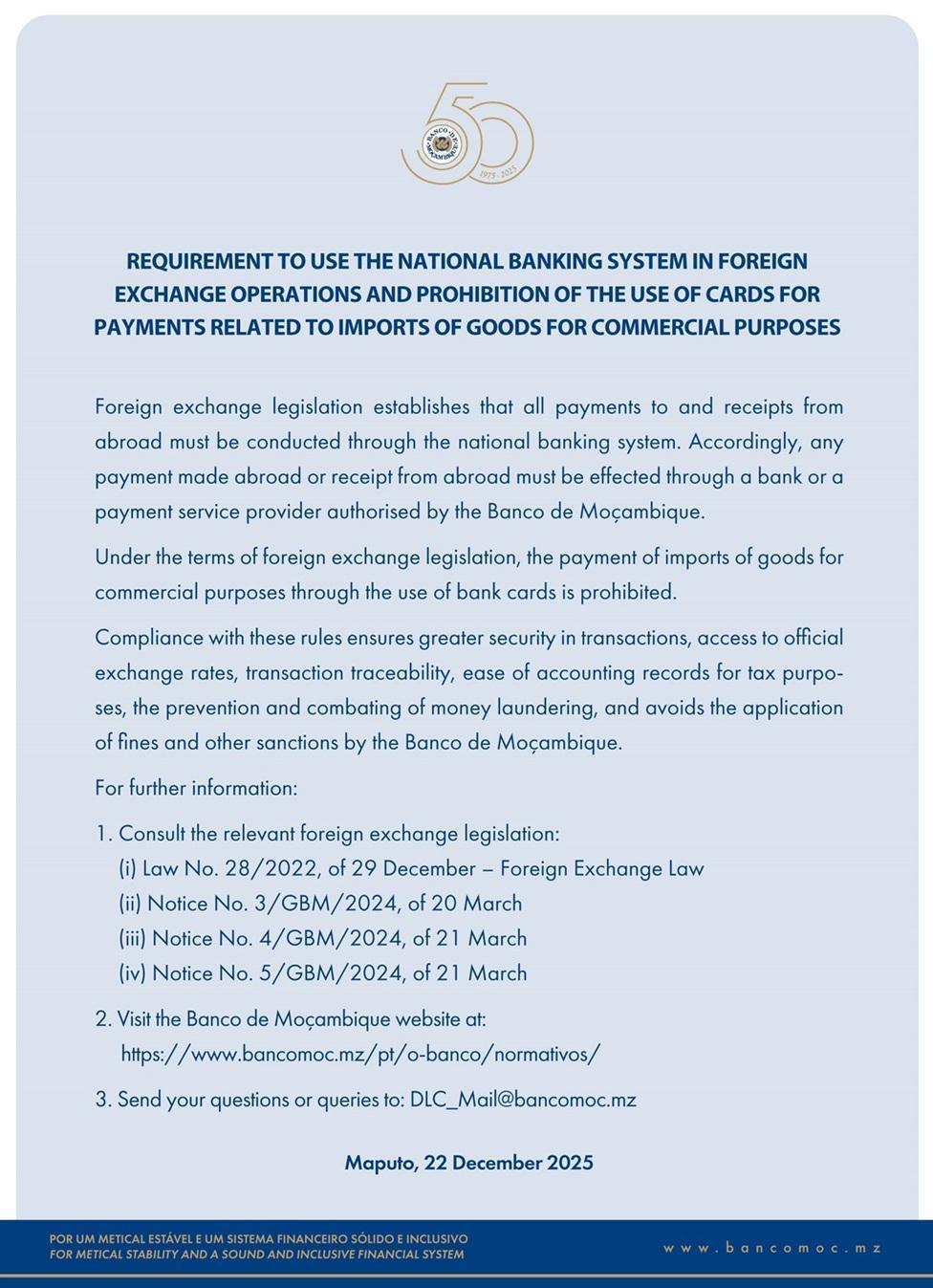 The Bank of Mozambique emphasises that compliance with these rules ensures greater security in transactions, access to official exchange rates, transaction traceability, ease of accounting records for tax purposes, the prevention and combating of money laundering, and avoids the application of fines and other sanctions by the Banco de Moçambique.