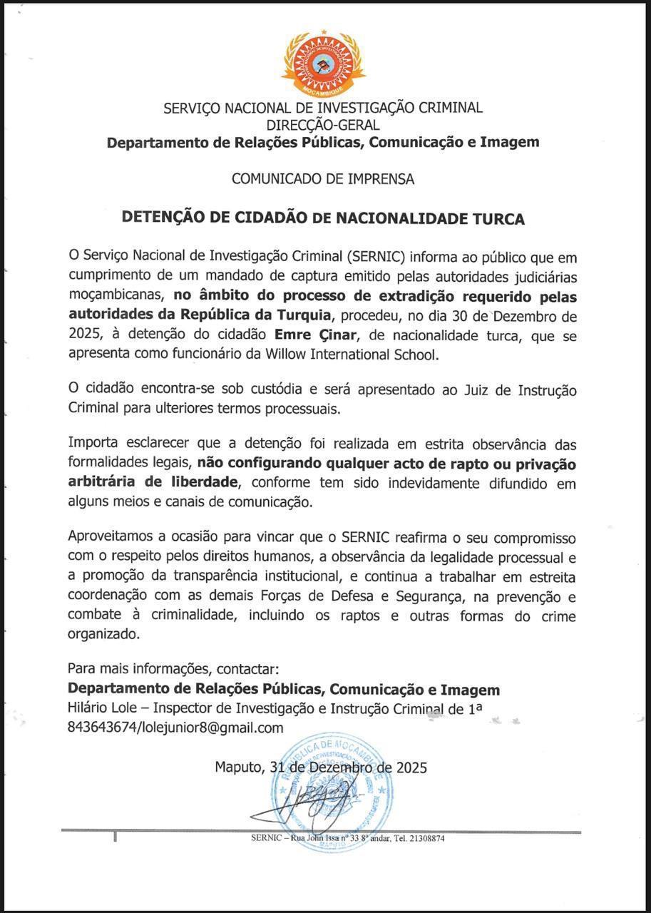 Mozambique’s National Criminal Investigation Service (SERNIC) has arrested a Turkish citizen based on an extradition request from Turkey. The arrest was conducted in accordance with legal procedures, countering claims of kidnapping. The individual, reportedly an employee at a private school, will face further legal proceedings.