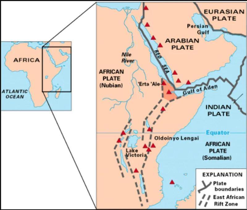 The feature in question is the East African Rift System (EARS), an active continental rift zone that stretches downward for thousands of kilometers from roughly north to south through Ethiopia, Kenya, the Democratic Republic of the Congo, Uganda, Rwanda, Burundi, Zambia, Tanzania, Malawi, and Mozambique.The EARS is effectively a crack in the African plate that could split the continent into two plates – the smaller Somalian plate and the larger Nubian plate.