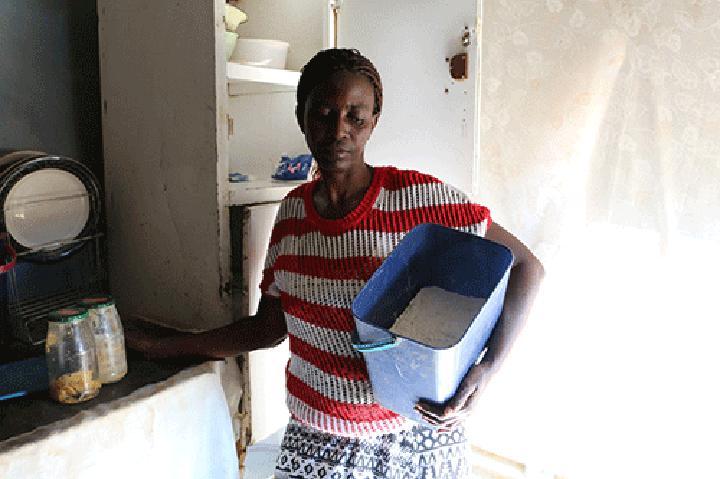 The woman is unemployed, and unable to feed her child. She relies on her neighbour, who gave her 2kg of mahangu flour to make porridge for her daughter.