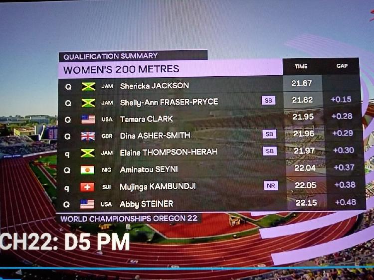 Tamara Clark of the United States won the heat in 21,95 seconds followed by Dina Asher Smith of Great Britain in 21,96, with Elaine Thompson-Herah of Jamaica third in 21,97.