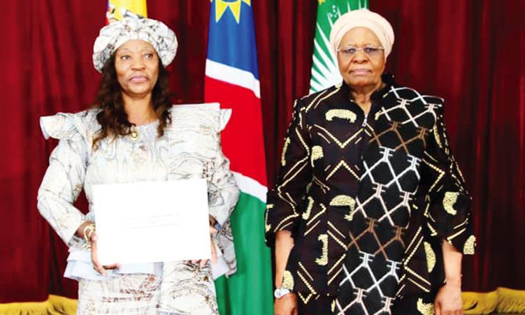 WELCOME… President Netumbo Nandi-Ndaitwah (right) congratulates the new minister in the Presidency, Charles Mubita.