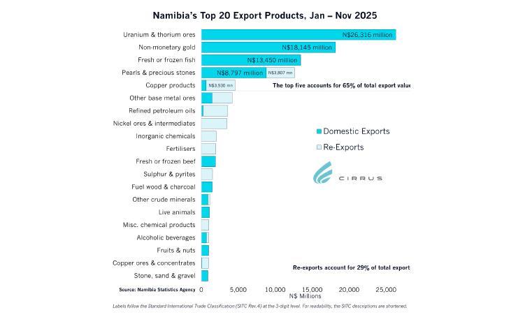 Africa-Press – Namibia. The total value of Namibia’s export basket from January to November 2025 came to N$115 billion, with primary commodities carrying most of the basket.