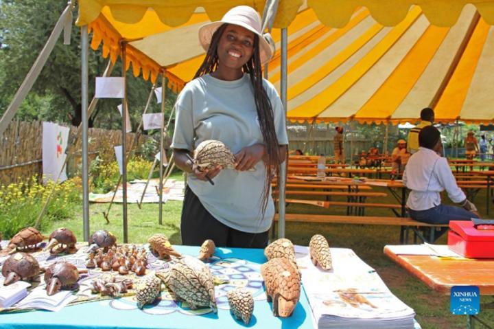 Pangolin replica products are displayed during an event to raise awareness on saving pangolin in Windhoek, Namibia, on Feb. 19, 2022. Namibia has recorded a total of 320 cases of crimes involving pangolins in the last five years since 2017, a government official said Saturday as the country celebrated World Pangolin Day.