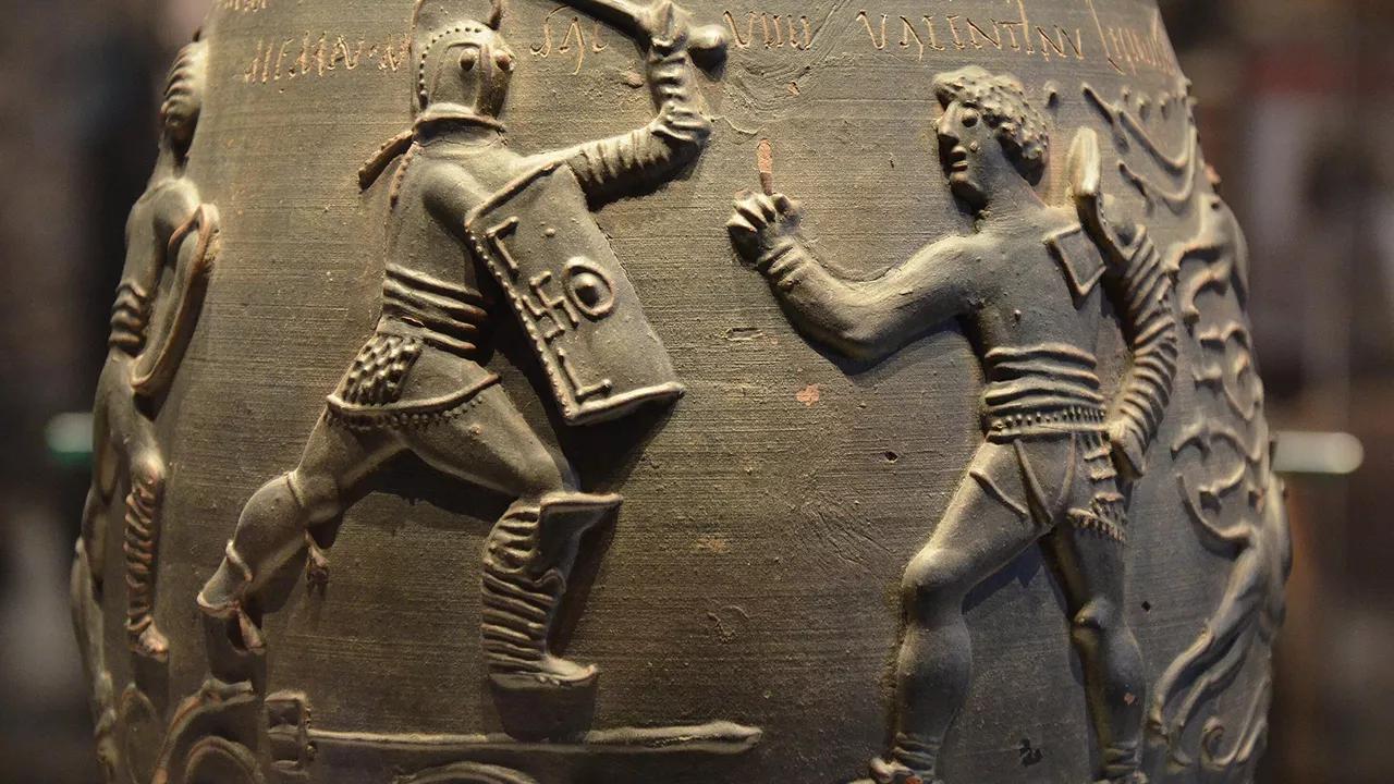 Three scenes of gladiatorial battles (human-human, human-animal, and animal-animal) are depicted on the outer walls of the 23-centimeter-high vessel, and the names of the fighters are scratched in: Secundus, Mario, Memnon, Valentinus.