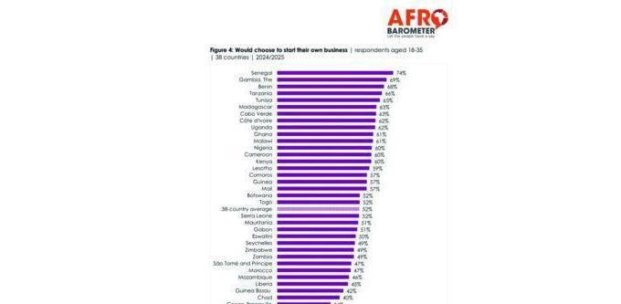 Across the continent, an average of 52% of young people say they want to start their own businesses, with countries such as Senegal at 74%, The Gambia at 69%, Benin at 68%, and Tanzania at 66% leading the way.