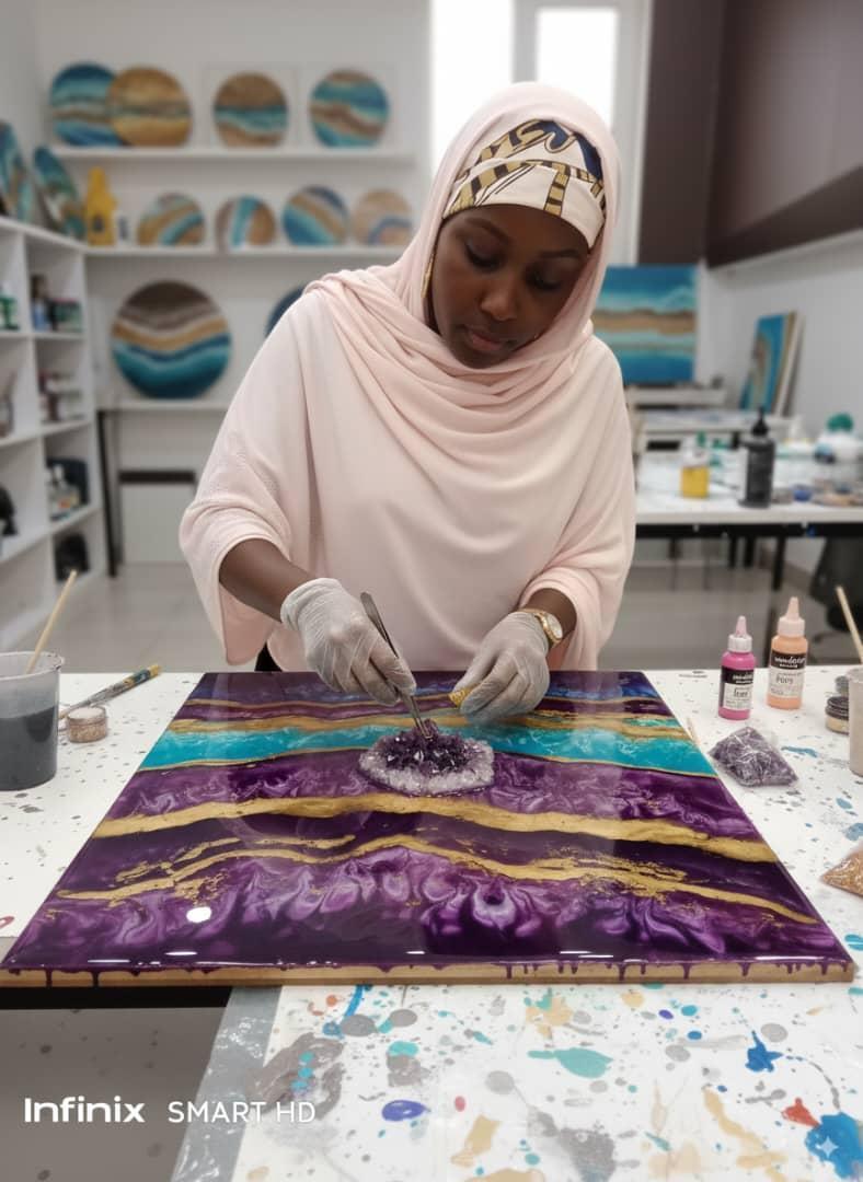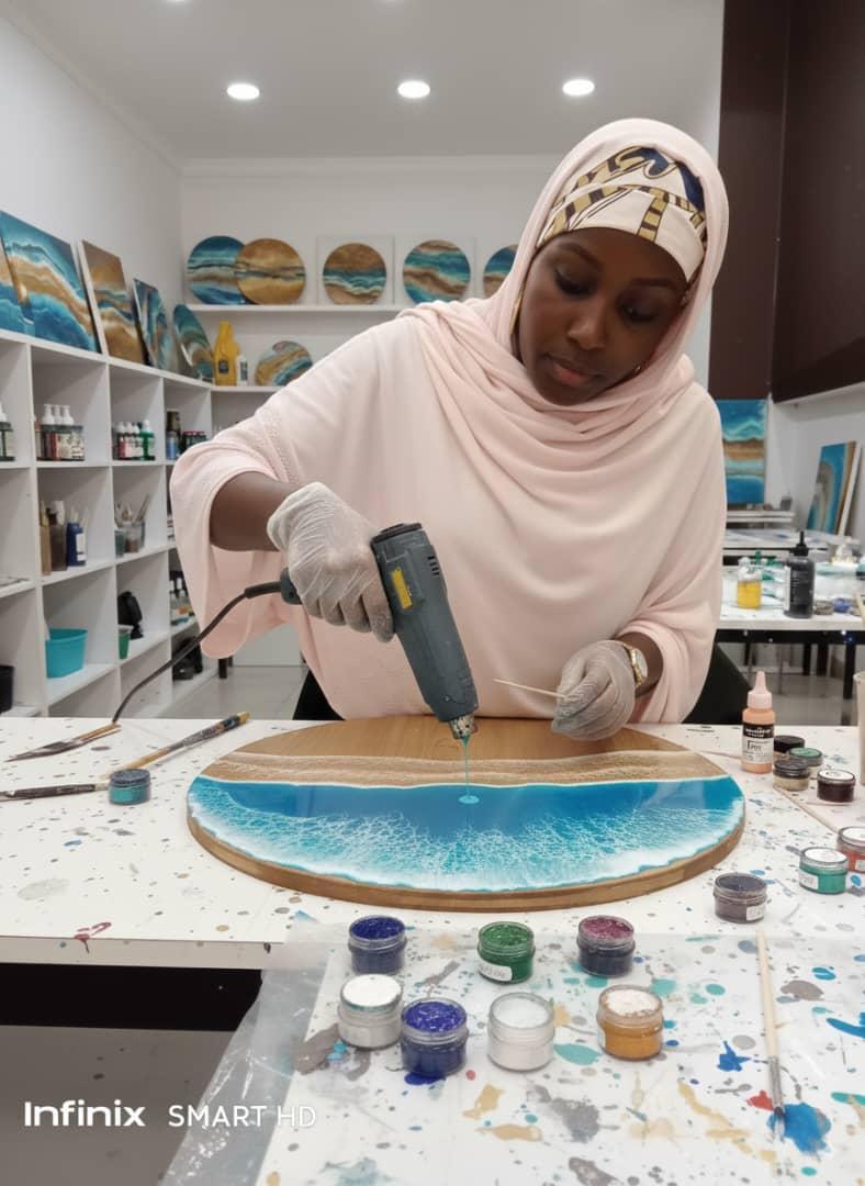 Le processus de réalisation des œuvres en résine et en art filaire diffère nettement. « Pour l’art en résine, il faut procéder à la préparation du moule, au mélange de la résine avec les pigments, au coulage de la résine, au séchage et au démoulage, puis à la finition avec le polissage ou l’ajout de détails. Pour l’art filaire, il est nécessaire de créer un design ou un motif, d’enfoncer les clous ou punaises sur la planche, puis d’enrouler le fil autour des clous afin de former le motif. Il faut préciser que l’art de la résine est davantage lié à la création d’objets en trois dimensions, avec une finition lisse ; tandis que le string art est une technique de création de motifs géométriques à partir de fils tendus», précise Rahina Hamadou Moussa.