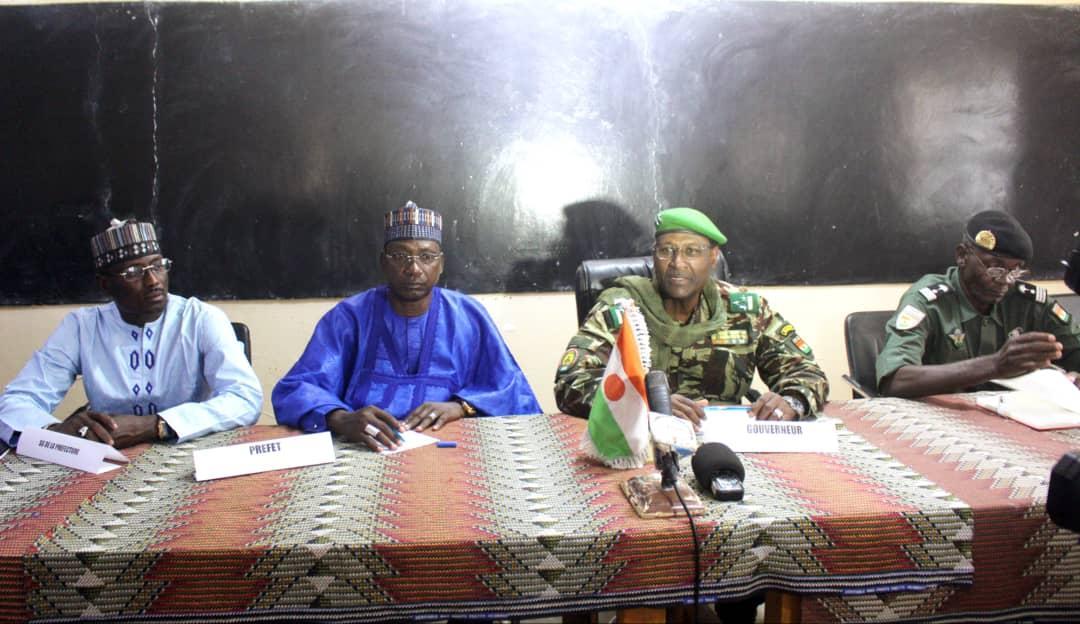 Après les visites de terrain, le Gouverneur Mahamadou Ibrahim Bagadoma a présidé, dans la grande salle de la mairie de Goudoumaria, une réunion de travail avec les autorités administratives, coutumières et municipales, les responsables techniques départementaux, les associations de la société civile, les structures féminines et de jeunesse, ainsi que plusieurs citoyens.