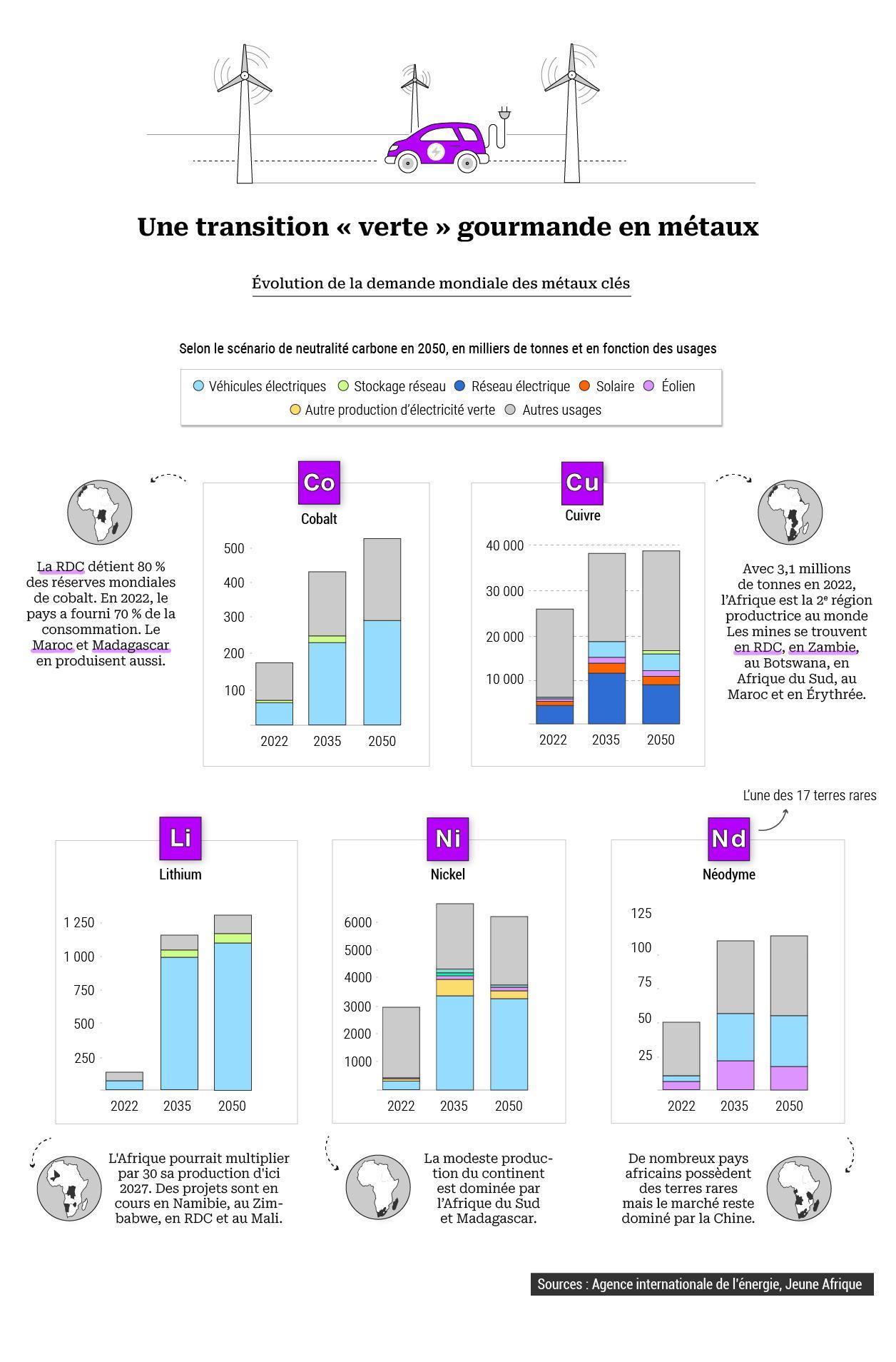Afin de mesurer les futures répercussions de cette transition sur le secteur des métaux rares en Afrique, nous avons retenu le scénario aboutissant à la neutralité carbone d’ici à 2050. Les chiffres sont sans ambiguïté : la production va exploser au même rythme que la demande. Le détail, métal par métal :