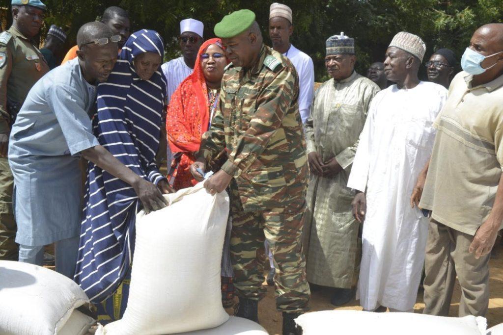 Africa-Press – Niger. Le village de Kongou Zarmanganda situé à 14 kilomètres de Niamey a servi de cadre au lancement officiel de la distribution gratuite ciblée de vivres ce mercredi 29 octobre 2025. C’est l’Administrateur délégué de l’arrondissement communal Niamey IV, le Chef d’Escadron, Ali Kassou qui a procédé au lancement de cette opération qui concernera à terme 1200 ménages vulnérables qui ont bénéficié de 120 tonnes de céréales.