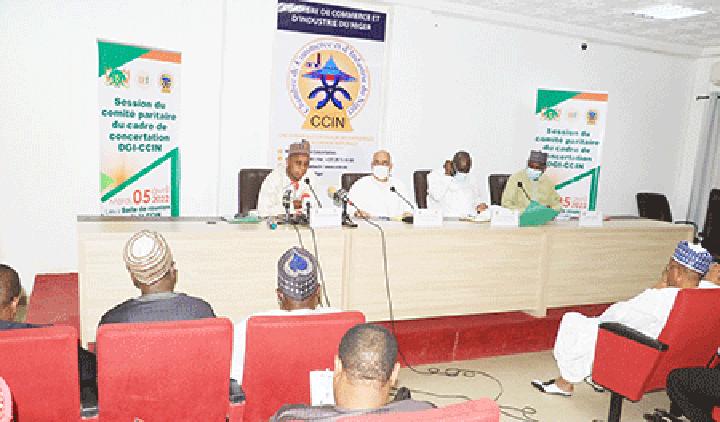 Africa-Press – Niger. Le directeur général des impôts M. Mal Ousmane Mahamane a présidé hier matin conjointement, avec le président de la Chambre de commerce et de l’industrie du Niger (CCIN), M. Moussa Sidi Mohamed, la première session du comité paritaire du cadre de concertation des deux institutions. Cette initiative marque la ferme volonté des deux structures de prendre en compte et de traiter les préoccupations des opérateurs économiques. Aussi, elle traduit la volonté du gouvernement de toujours maintenir le dialogue avec le secteur privé et cela dans le but d’atteindre ‘’une véritable croissance de l’économie’’.