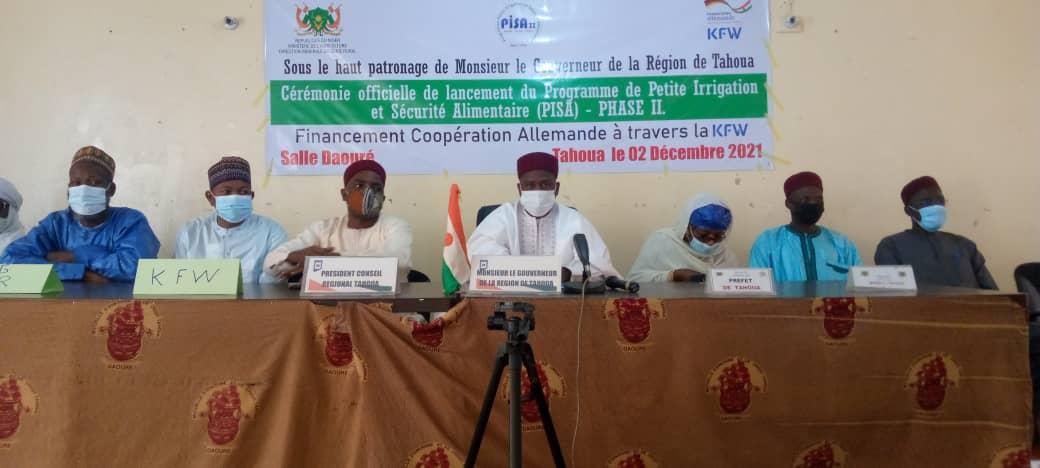 Africa-Press – Niger. -Le gouverneur de la région de Tahoua, M. Issa Moussa a présidé, ce jeudi 2 décembre 2021, la cérémonie officielle de lancement du Programme de la petite irrigation et sécurité alimentaire (PISA)-phase Il à la salle des réunions de la mutuelle Daoure.