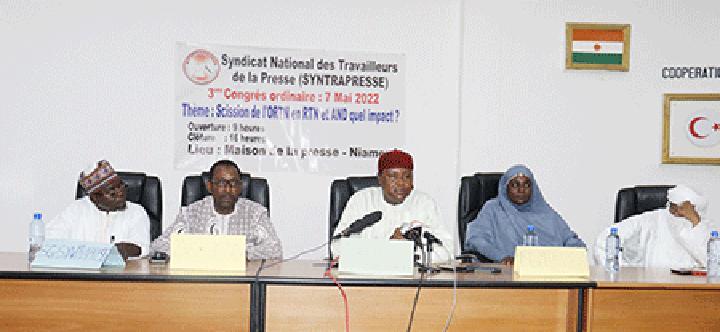 Africa-Press – Niger. Le Syndicat National des Travailleurs de la Presse (SYNTRAPRESSE), a tenu le samedi 7 mai 2022, son 3ème congrès ordinaire à la Maison de la presse de Niamey. Au cours de ces assises, placé sous le thème, « Scission de l’ORTN en RTN et AND : quel impact?, les congressistes ont renouvelé le bureau exécutif national. Ainsi, ils ont placé leur confiance à M. Issoufou Samaila, pour un mandat de 4 ans. Pour rappel, le SYNTRAPRESSE est une structure syndicale composée des agents de la RTN, de l’ONEP, de l’ANP, l’IFTIC et de l’AND.