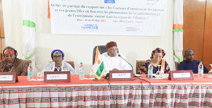 Africa-Press – Niger. Du 29 au 30 mars, le Centre Nigérien des Droits de l’Homme pour la Paix et le Développement organise à Niamey, avec l’appui technique et financier de Search For Commun Ground et ONU FEMMES Niger, un atelier de partage du rapport sur les facteurs d’enrôlement des femmes et des jeunes filles dans la région de Tillabéri en lien avec les phénomènes de la radicalisation et de l’extrémisme violent. Cette rencontre est l’occasion pour les parties prenantes de pouvoir disposer d’informations pertinentes et surtout d’élaborer des projets et programmes qui contribueront non seulement au renforcement de capacité de résilience des femmes mais aussi de réduire le risque d’enrôlement des femmes ou filles jeunes par des groupes armés.