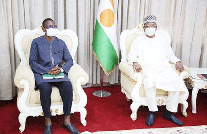 Africa-Press – Niger. Le Premier ministre, Chef du gouvernement, M. Ouhoumoudou Mahamadou s’est entretenu, le vendredi 5 nombre 2021, avec l’ambassadeur de la République Islamique de Mauritanie, S.E Sidati Cheikh Ould Ahmed Aicha. Le diplomate mauritanien a dit avoir rendu au Premier ministre une visite de courtoisie. S.E Sidati Cheikh Ould Ahmed Aicha est aussi porteur d’un message de fraternité et d’amitié du Président de la République Islamique de Mauritanie, du gouvernement et de son peuple au Président de la République du Niger, au gouvernement et au peuple nigérien. «La Mauritanie et le Niger constituent un seul peuple, mais le destin a voulu à ce que ça soit deux Etats. Nous avons une coopération commune parce que nous sommes tous les deux membres fondateurs du G5 Sahel auquel nos deux Etats croient profondément. Notre coopération au niveau bilatéral est excellente ; elle est séculaire et le Premier ministre m’a fait savoir que cette coopération sera renforcée par la tenue prochaine de la grande réunion de la commission mixte Nigéro-Mauritanienne de coopération. C’est pourquoi, je profite de cette occasion pour saluer le Niger et son peuple frère, ainsi que les autorités en place», a déclaré le diplomate mauritanien.