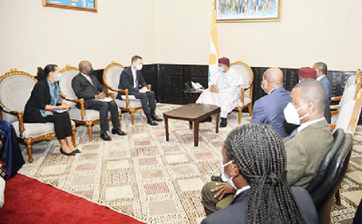 Africa-Press – Niger. Le Président de la République SEM. Mohamed Bazoum a reçu hier matin en audience une délégation de la Banque Mondiale en mission au Niger. Cette délégation était conduite par le Vice-président de la Société Financière Internationale (SFI) M. Sergio Pimenta accompagné de l’administrateur de la Banque Mondiale pour le Niger M. Alphonse Kouagou et de la représentante du nouveau bureau permanent de la SFI à Niamey Mme. Haoua Coulibaly.