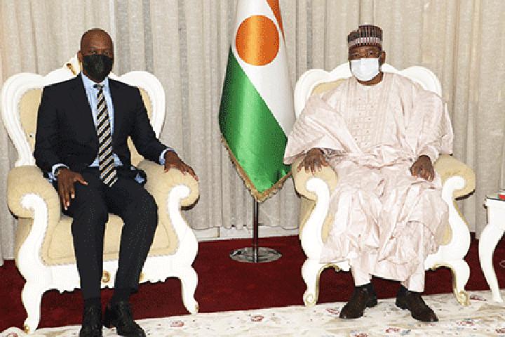 Africa-Press – Niger. Le Premier ministre, chef du gouvernement, M. Ouhoumoudou Mahamadou a accordé, hier 30 août 2021, une audience au Secrétaire général de la Zone de Libre-Echange Continentale Africaine (ZLECAf), M. Wamkele Mene, en visite de travail à Niamey. Au cœur des échanges, la situation de la ZLECAf et le leadership du Niger au sein de cette institution continentale.