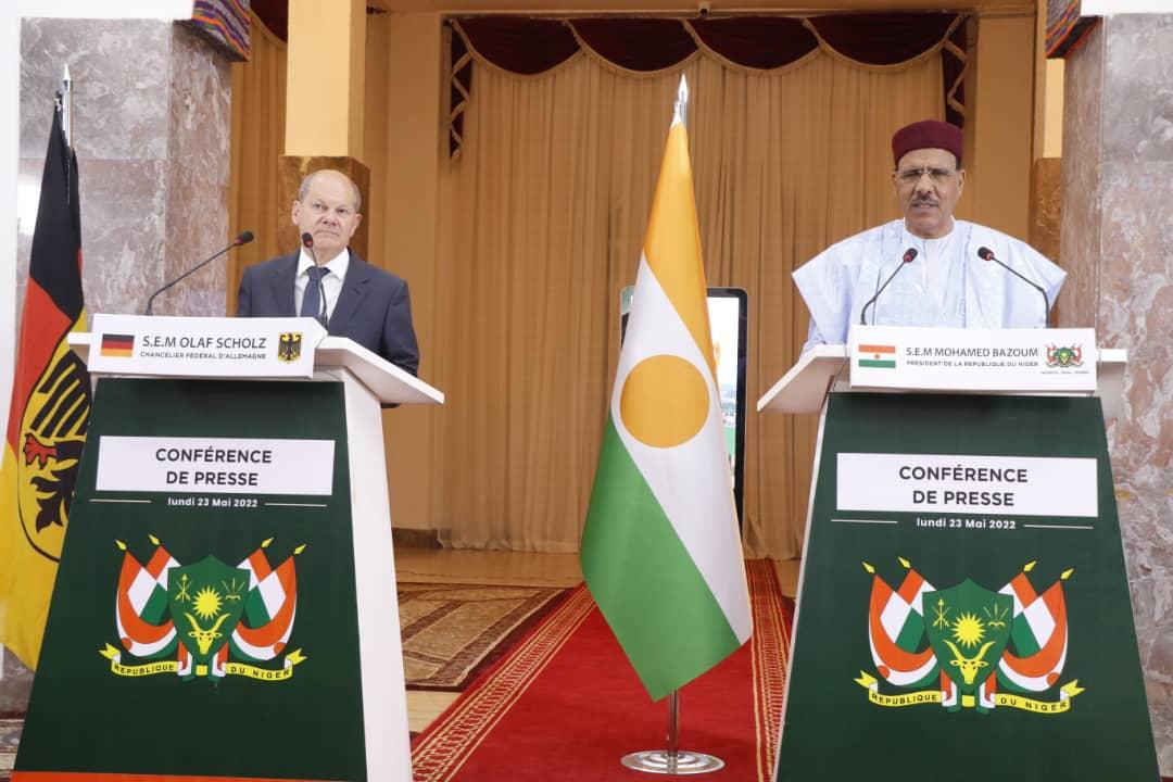 Africa-Press – Niger. Le Président de la République Mohamed Bazoum s’est entretenu en tête en tête, en début d’après-midi de ce lundi 23 mai 2022 au palais de la présidence, avec le Chancelier Allemand M. Olaf Scholz en visite de travail de 24h au Niger.