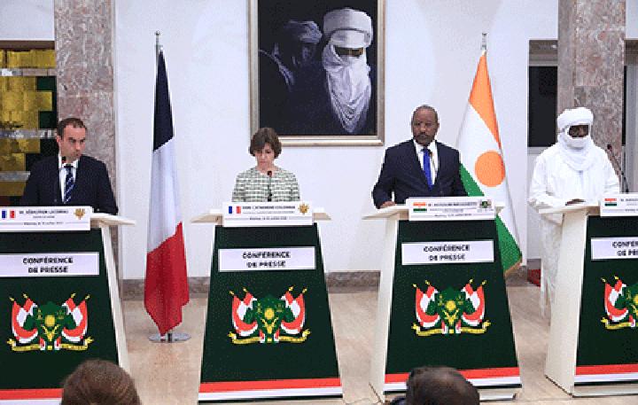 Africa-Press – Niger. Peu après l’audience avec le Chef de l’Etat, les deux ministres français Mme Cathérine Colonna et M. Sébastien Lecornu ont conjointement animé une conférence de presse avec leurs homologues du Niger, le ministre d’Etat en charge des Affaires Etrangères et le ministre de la Défense Nationale. C’était l’occasion pour les deux parties d’expliquer à l’opinion nationale et internationale les contours du nouveau partenariat privilégié entre la France et le Niger en matière de lutte contre le terrorisme et le soutien au développement. À travers cet accord, les partenaires du Niger vont continuer à soutenir le pays afin de lui permettre de monter progressivement en puissance. Le but, c’est de faire en sorte que le Niger puisse se passer de cette assistance.