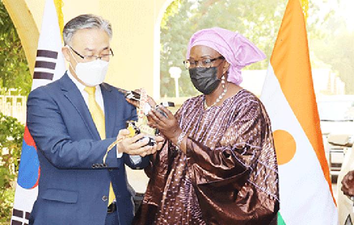 Africa-Press – Niger. La République de Corée du Sud vient d’offrir cinq véhicules de marque coréenne d’une valeur d’environ 100 millions de FCFA au Ministère des Affaires Etrangères et de la Coopération. C’est l’Ambassadeur de la République de Corée du Sud auprès du Niger avec résidence en Côte d’Ivoire S.E. LEE Sang Ryul qui a remis les clés à la secrétaire générale du Ministère des Affaires Etrangères et de la Coopération Mme Diallo Amina Djibo au cours d’une cérémonie qui s’est déroulée hier après midi dans les locaux du Ministère.