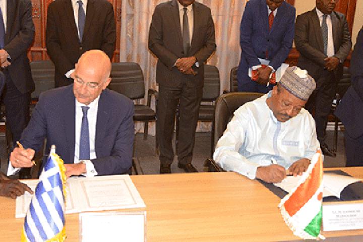 Africa-Press – Niger. Le ministre d’Etat, ministre des Affaires Etrangères et de la Coopération, M. Hassoumi Massoudou, et le ministre Grec des Affaires Etrangères, M. Nikos Dendias, en visite de travail à Niamey, ont procédé, hier dans les locaux dudit Ministère, à la signature du Protocole d’Entente relatif aux consultations politiques et du Mémorandum d’Entente, relatif à la coopération en matière de formation diplomatique, entre le Niger et la République Hellénique (Grèce). Ces deux (2) documents d’Entente ont été paraphés en présence de l’ambassadeur de la Grèce au Niger, M. Efthy Mios-Georges Costopoulos.