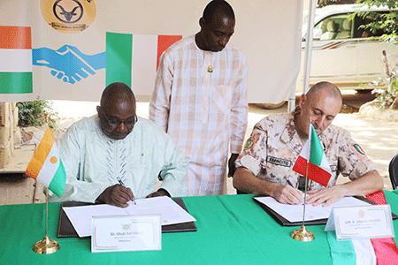 Quant au Général de Brigade Liberato Amadio, il a noté que la MISIN, tout comme la Brigade de Sapeurs-Pompiers, a pour objectifs la sécurisation des populations, de leur bien-être et de la promotion de la paix. «Les objectifs étant les mêmes nous devons travailler, la main dans la main, et cela au profit de nos deux peuples Italien et Nigérien», a souligné le Général Italien. La cérémonie a pris fin, comme à la MIG, par la signature du procès-verbal et la découverte inaugurale du matériel réceptionné, le tout sous les applaudissements nourris des invités. La Mission Italienne de Soutien au Niger (MISIN) coopère avec les autorités nigériennes depuis 2018, contribuant à la formation des forces armées et de sécurité et mettant en œuvre des projets de coopération identifiés et convenus avec les institutions civiles. Elle a pour principales missions de soutenir le développement des capacités des FDS nigériennes, dans le cadre d’un effort conjoint de stabilisation de la zone et de renforcement des capacités de contrôle du territoire par les autorités du Niger et des pays du Sahel, afin de contrer les trafics illicites et les menaces sécuritaires ; de mener des activités d’éducation, de formation, de conseil, d’assistance et d’appui aux FDS, proposées par les institutions nigérienne et convenues avec elles, et renforcer leurs capacités globales. Elle vise aussi à soutenir la population et les institutions civiles à travers des projets de coopération civilo-militaires, identifiés, convenus et planifiés avec les échéances à court et moyen termes. Enfin, la MISIN contribue aux activités de développement dans la composante aérienne de la République du Niger.