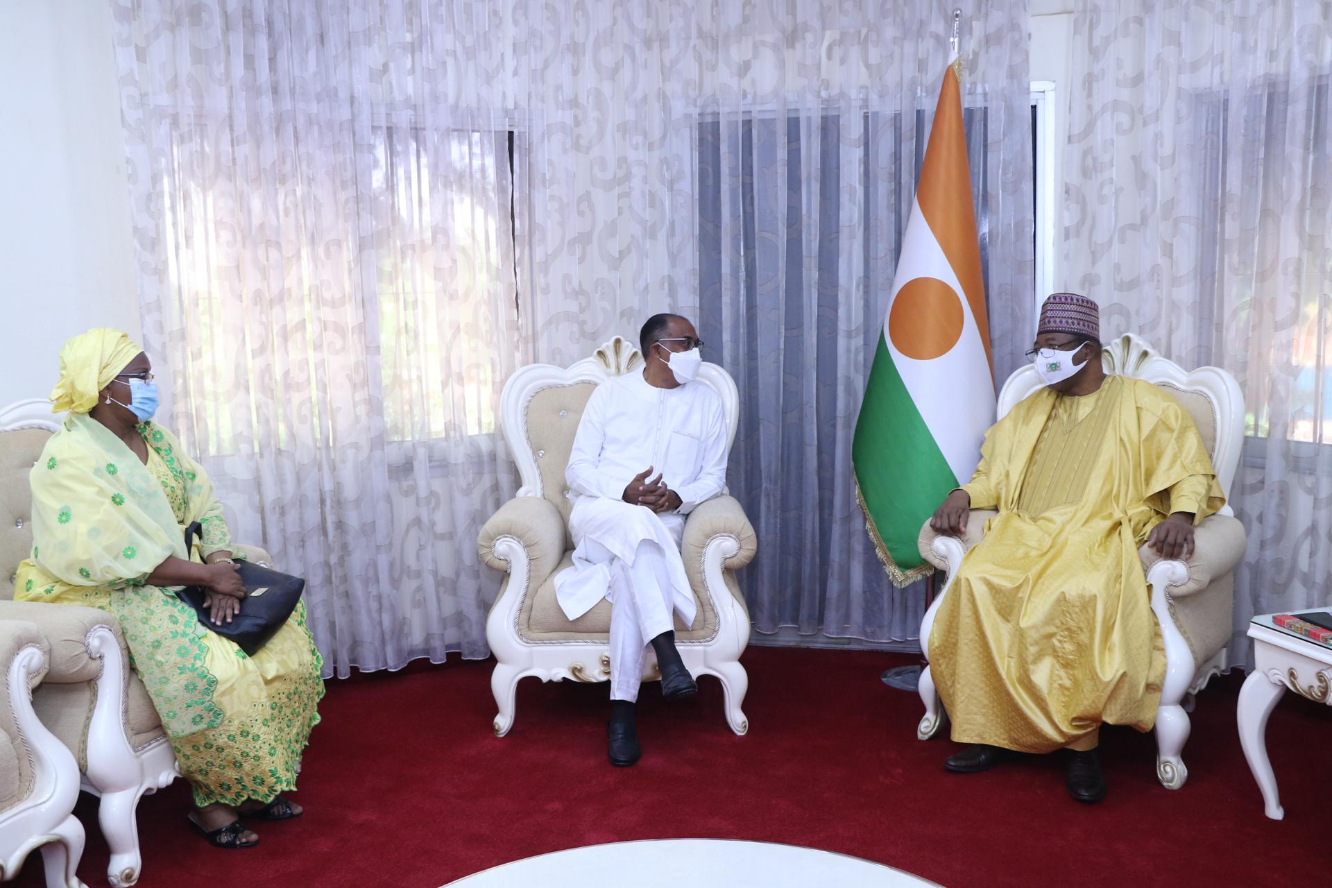 Africa-Press – Niger. Le Premier Ministre Ouhoumoudou Mahamadou s’est entretenu, en début de matinée de ce vendredi 18 juin 2021 à son cabinet, avec l’envoyé spécial de l’Union Africaine pour l’Agence africaine du Médicament (AMA), M. Michel Sidibé.