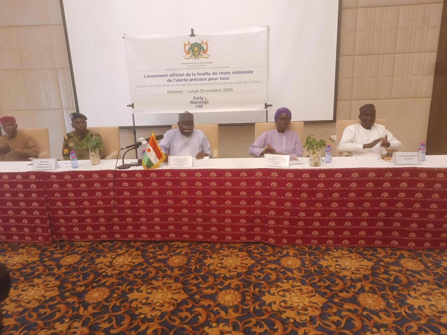 Africa-Press – Niger. Le Secrétaire général de la Présidence de la République, M. Mossi Salou a présidé, ce lundi 13 octobre 2025 à l’hôtel Bravia de Niamey., la cérémonie officielle de lancement de la feuille de route nationale de « Alerte précoce pour tous », couplée à une remise d’équipements à la salle de veille du Centre opérationnel de veille, d’alerte et de conduite de crise (COVACC).