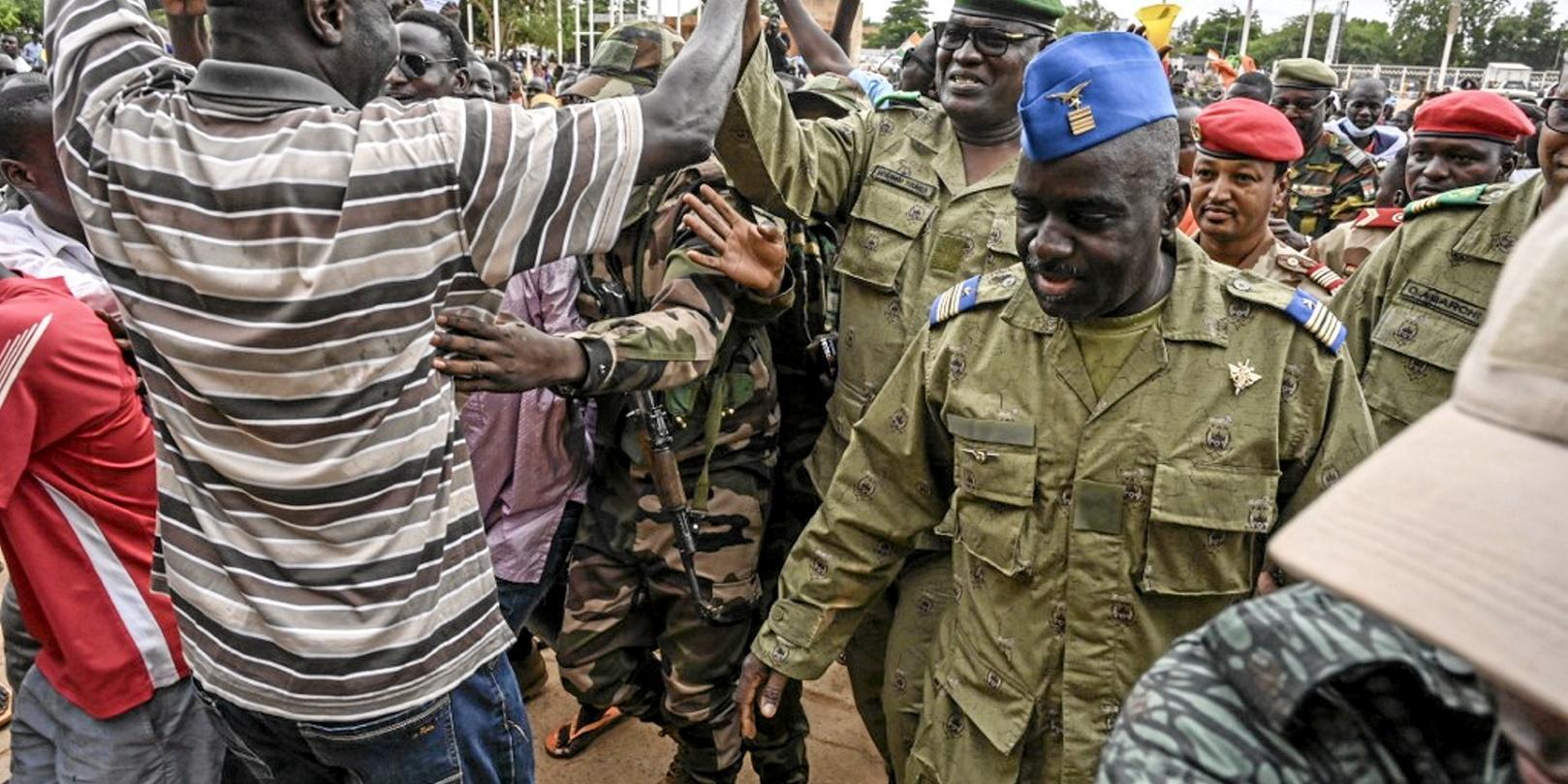 « Aujourd’hui, c’est le jour de notre véritable indépendance ! » criait un jeune homme, la foule autour de lui lançant des « À bas la France, à bas la Cedeao ! », instance qui a menacé d’intervenir militairement. Des membres du Conseil national pour la sauvegarde de la patrie (CNSP, qui a pris le pouvoir) sont arrivés triomphalement au stade dans un convoi de véhicules pick up, acclamés et entourés par une foule enfiévrée.