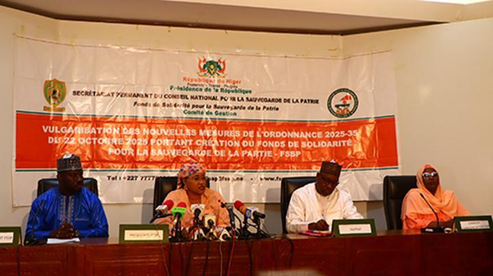 Africa-Press – Niger. La présidente du comité de gestion du Fonds de Solidarité pour la Sauvegarde de la Patrie (FSSP), Mme Réki Moussa Hassane Djermakoye, a animé, le lundi 29 décembre 2025 à Niamey, un point de presse pour restituer les résultats de sa mission à l’intérieur du pays. Cette tournée de sensibilisation et de vulgarisation de l’ordonnance 2025-35 a permis à la présidente du comité de gestion et à son équipe de constater les dispositions aprises dans le cadre de la collecte spéciale suite à l’appel de Tillabéri du président de la République, le Général d’Armée Abdourahamane Tiani. Suite à la demande du Chef de l’Etat d’octobre dernier, les citoyens ont contribué à hauteur de 772 690 665 FCFA à l’effort de souveraineté.