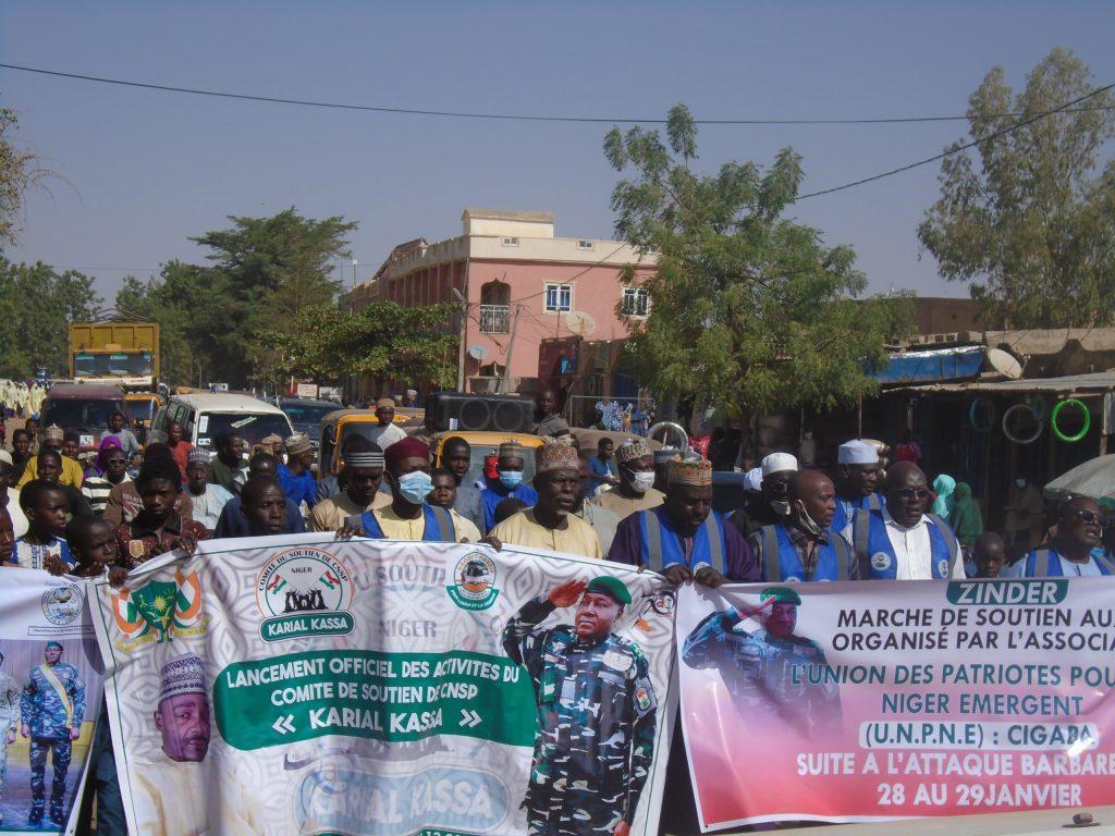 Africa-Press – Niger. Suite à l’attaque perpétrée dans la nuit du 28 au 29 janvier 2026 contre la Base 101 de l’Aéroport international Diori Hamani de Niamey, plusieurs structures socioprofessionnelles de la Ville de Zinder ont organisé des marches et des meetings pour apporter leur soutien au Conseil National pour la Sauvegarde de la Patrie (CNSP) et aux Forces de Défense et de Sécurité.