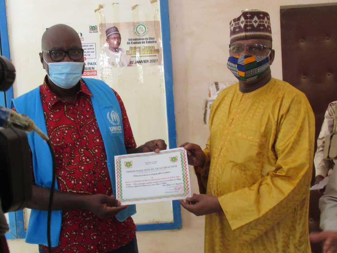 ‘’Grâce à votre sens du devoir, votre capacité managériale et votre humanisme envers les réfugiés et les personnes déplacées, le HCR a effectué plusieurs réalisations et atteint ses objectifs au grand bonheur des populations dont entre autres, la création de 03 camps de réfugiés à Ayerou, Abala et Ouallam ; la construction de 07 classes scolaires pour les réfugiés, les déplacés et les populations d’accueil ; la création d’une station de traitement d’eau à Ayerou; la construction de 576 maisons dans le cadre du projet pilote UNHCR/Plan/International GIZ ; la construction de 03 guichets uniques à Abala, Ayerou et Ouallam ; la construction de 02 Centres de Santé intégré (CSI) de type II avec logement du médecin et sage femme ; la construction de plusieurs forages à Abala’’ a notifié le Gouverneur de la région.