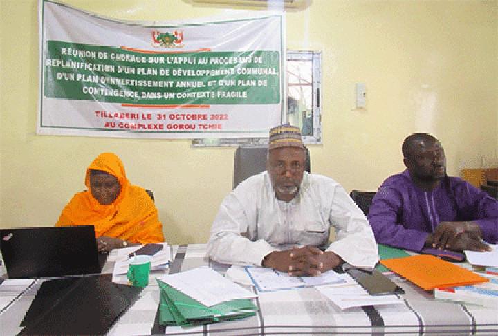 Africa-Press – Niger. Le Secrétaire Général Adjoint de la Région de Tillabéri, M. Boubacar Soumana a présidé, le lundi 31 octobre 2022, une réunion de cadrage sur l’appui au processus de replanification d’un plan de développement communal, d’un plan d’investissement annuel et d’un plan de contingence dans un contexte de fragilité. C’était dans la salle de réunions du Complexe Gorou Tchié en présence du Président du Conseil Régional de Tillabéri ; de la Préfète du Département de Tillabéri ; des directeurs centraux, régionaux et départementaux de l’Aménagement du territoire et du développement communautaire ainsi que des responsables de projets et programmes et des représentants des ONG et Associations de Développement.