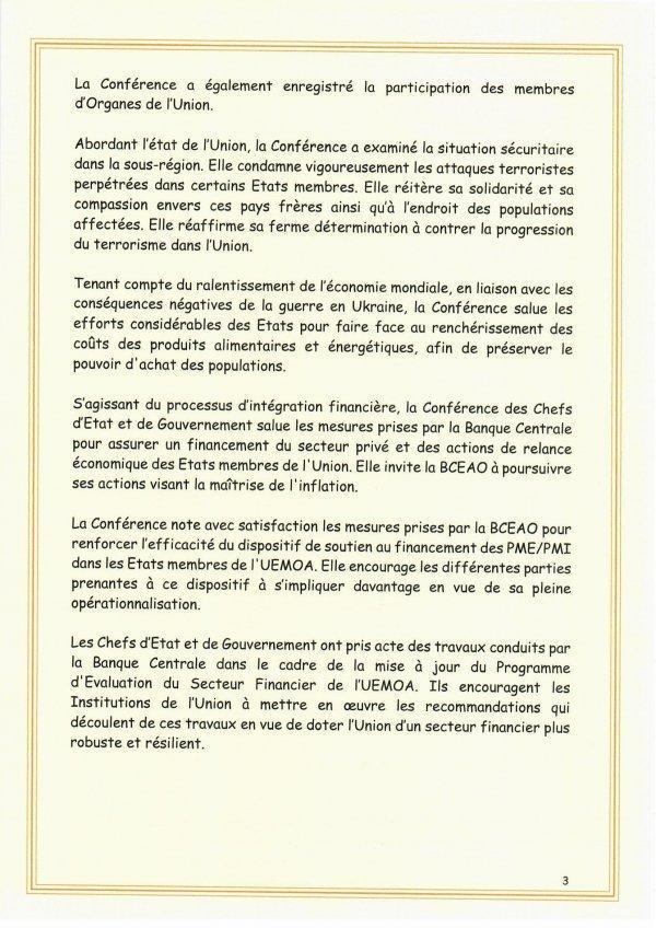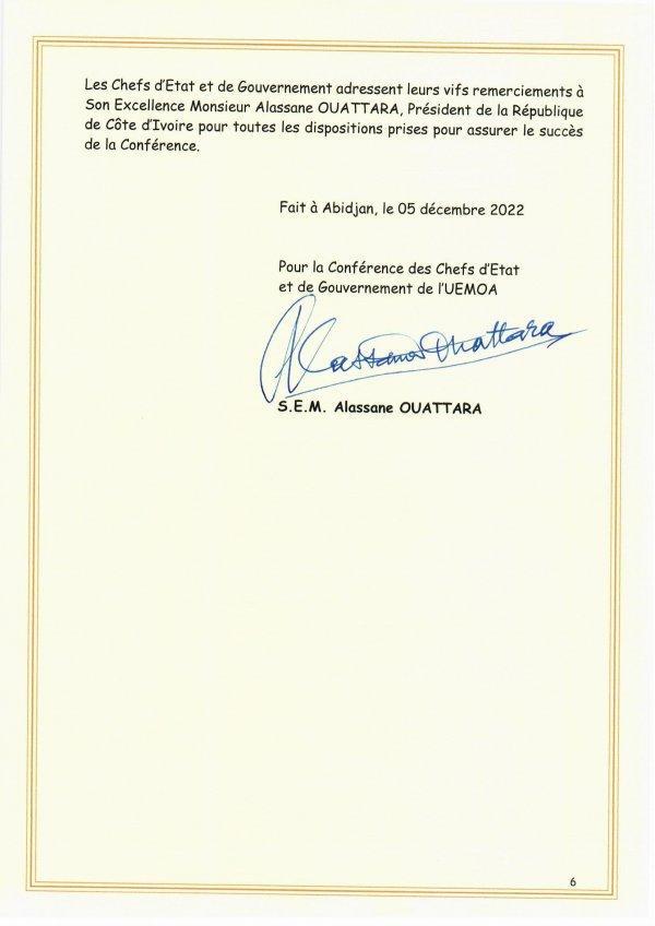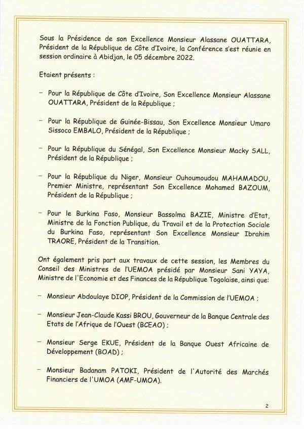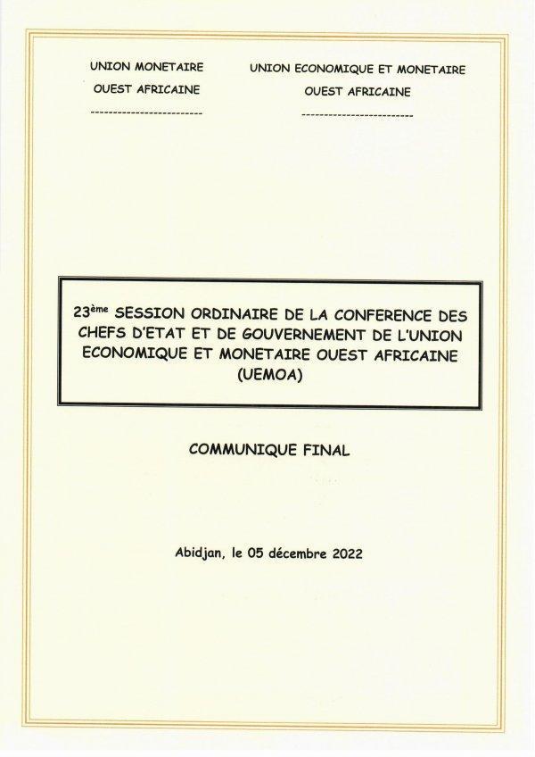 Africa-Press – Niger. La conférence des chefs d’Etat et de gouvernement de l’UEMOA est l’organe suprême qui définit les grandes orientations de la politique de l’union. La 23e session ordinaire s’est tenue le 5 décembre 2022, à Abidjan, sous la présidence du président de la Côte d’Ivoire, Alassane Ouattara. Il a été question au cours des travaux d’examiner la situation sécuritaire dans la sous-région. La cérémonie de clôture a été marquée par la lecture du communiqué final ci-après.