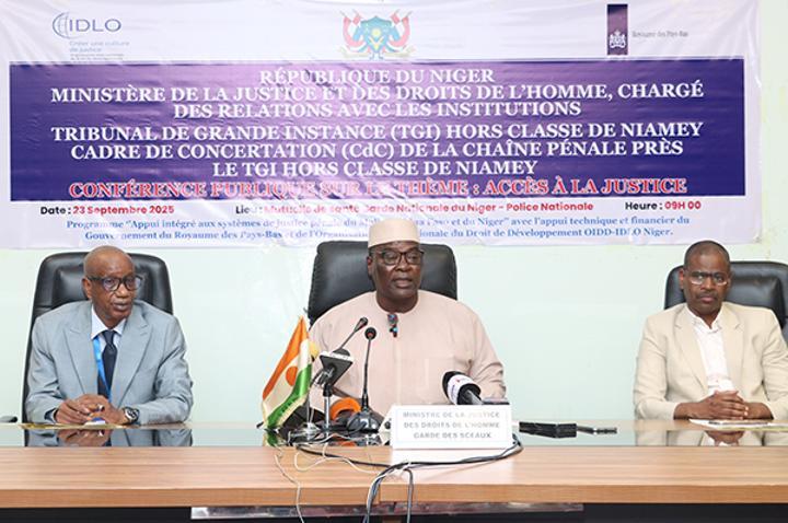 Africa-Press – Niger. Le ministre de la Justice et des Droits de l’Homme, Garde des Sceaux, Chargé des Relations avec les Institutions, M. Alio Daouda, a présidé, le mardi 23 septembre 2025 à Niamey, la cérémonie d’ouverture d’une conférence publique sur le thème de l’accès à la justice. Organisée par le cadre de concertation (CdC) de la chaîne pénale du Tribunal de Grande Instance, avec l’appui de IDLO et du Royaume des Pays-Bas, cette conférence vise à contribuer à rapprocher la justice des citoyens et favoriser l’amélioration d’une justice de qualité qui répond aux attentes de la population.