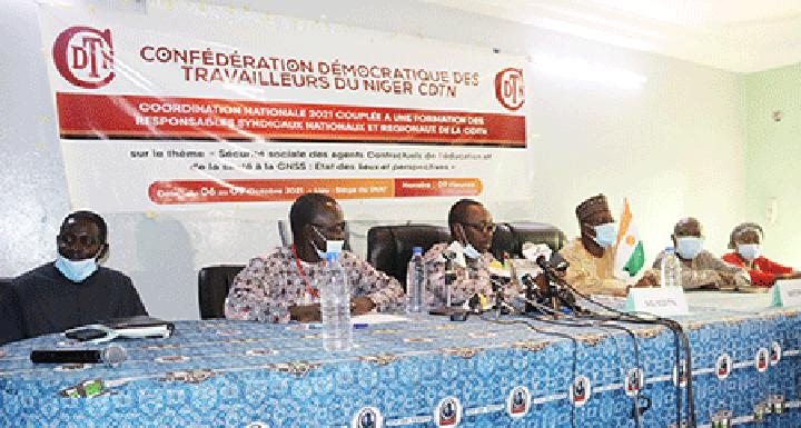 Par ailleurs, le Secrétaire Général de la CDTN, M. Idrissa Djibrila a, au nom de ces camarades, rappelé les différents points inscrits dans leur plateforme revendicative et a invité le Gouvernement à rouvrir le dialogue avec les partenaires sociaux. Il a souligné qu’au cours des assises de cette coordination qui vont durer du 6 au 9 octobre 2021, des formations seront organisées pour les participants. Il s’agit des délégués venus de toutes les régions du Niger. Plusieurs thématiques seront ainsi développées dont entre autres : « état de lieu sur les missions et les prestations de la CNSS, avec un accent sur l’importance de l’immatriculation et des cotisations sociales ; gestion de la sécurité sociale des agents contractuels par les ministères de tutelle et enfin, quelle passerelle entre le statut de contractuel et la fonction de l’Etat.