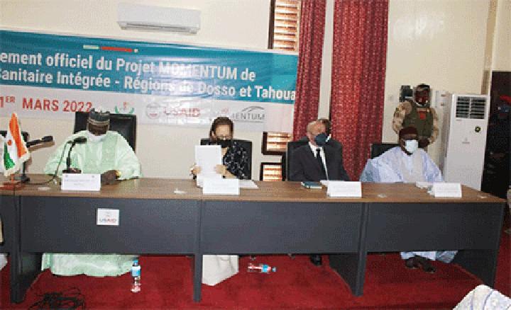 Africa-Press – Niger. Le ministre de la Santé publique, de la Population et des Affaires Sociales, Dr Idi Illiassou Maïnassara, a présidé, le mardi 1er mars, à Dosso, le lancement officiel des activités du projet Momentum de résilience sanitaire intégrée dans les régions de Dosso et Tahoua, un projet financé par l’USAID. La cérémonie s’est déroulée en présence du gouverneur de la région de Dosso M. Albachir Aboubacar, du Président du conseil régional de Dosso, des autorités administratives de Dosso, Tahoua, des cadres centraux et régionaux du ministère de la santé, des représentants du système des Nations Unies et des organisations internationales et de nombreux invités.