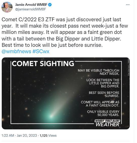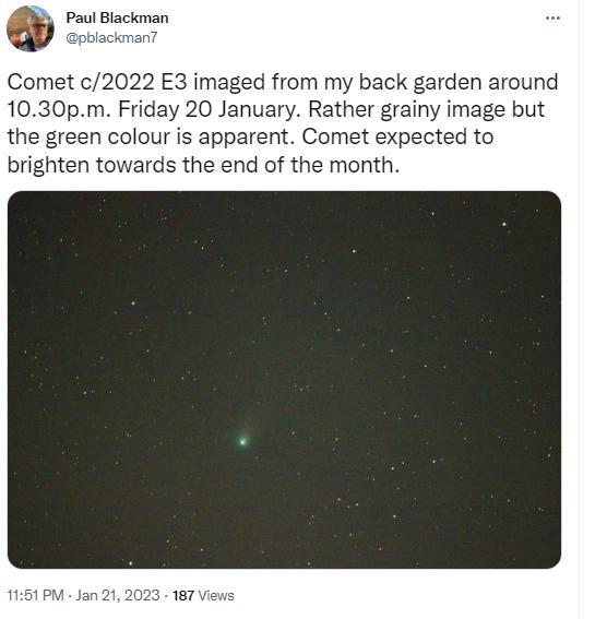 On the night of the new moon, January 21, which brought with it the darkest skies, the comet was close to Draco. This is a dragon-shaped constellation lodged between the Big Dipper and the Little Dipper. C/2022 E3 (ZTF) will be between the Big Dipper’s “cup” and Polaris on January 30.