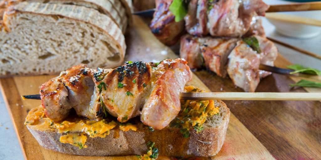 Spread flavoured butter onto the sliced bread. Add hot espetada chunks straight from the fire so the butter melts into the bread and serve.