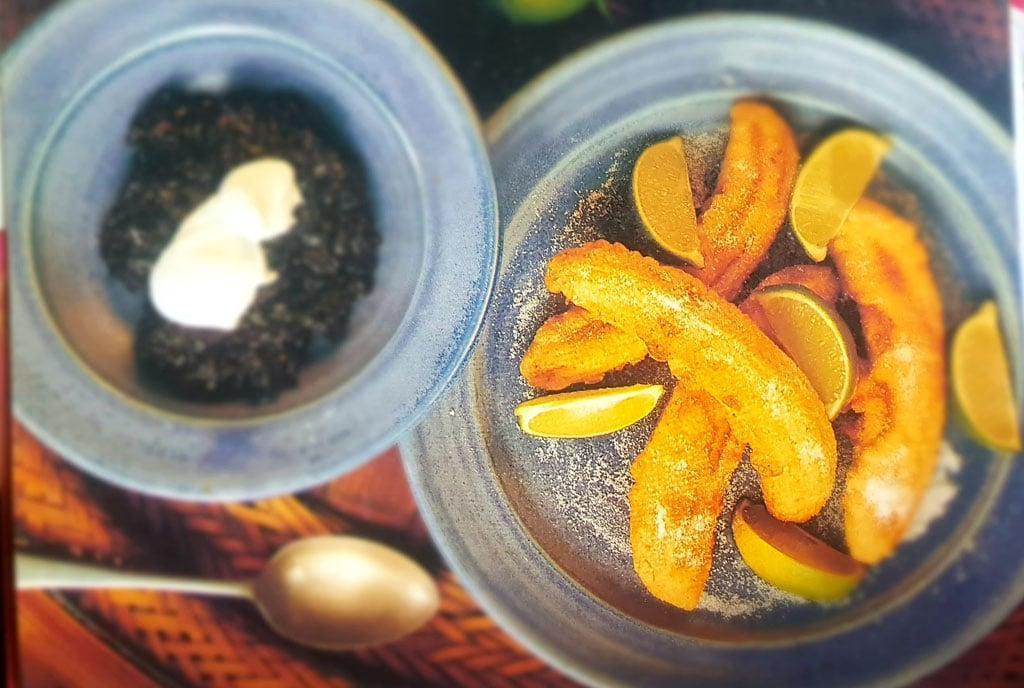 3.Heat the oil to 190°C/375°F or when a cube of day old bread browns within 30 seconds. Deep fry the battered bananas until crisp and golden. Drain and serve hot, dredged with sugar along with the lime wedges that you will squeeze over the bananas.