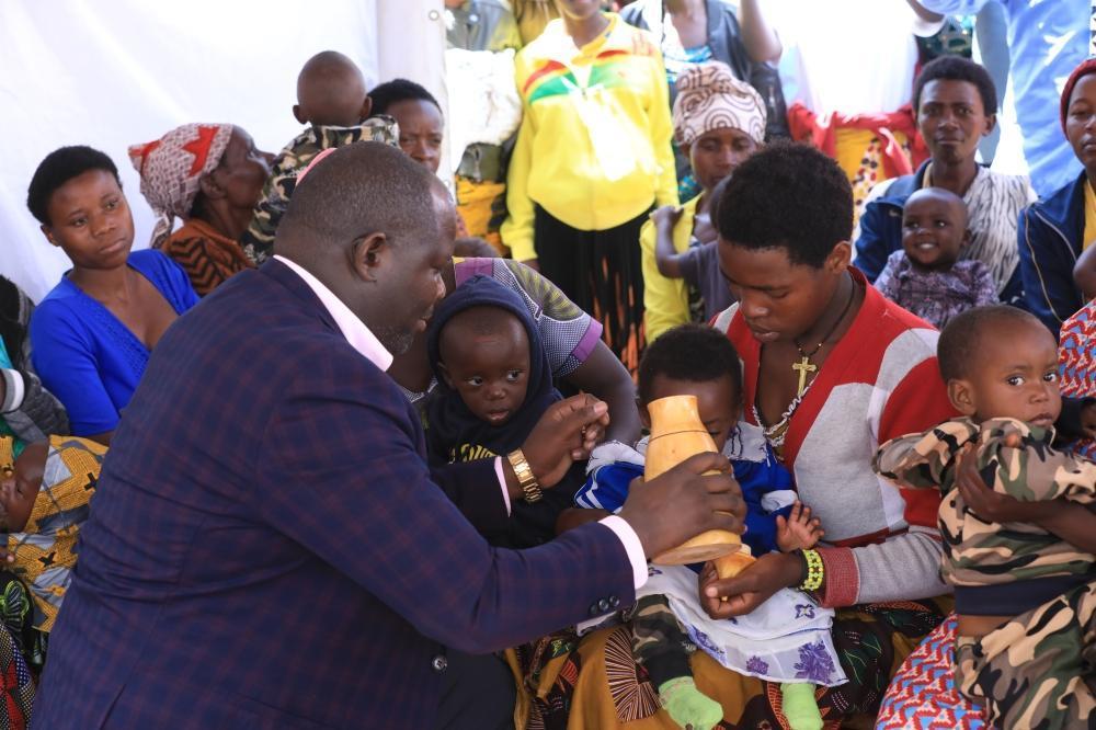 The Senior Pastor of ADEPR, Isaie Ndayizeye gives milk to children in line with the Church’s contribution to addressing malnutrition in Rwanda (ADEPR)